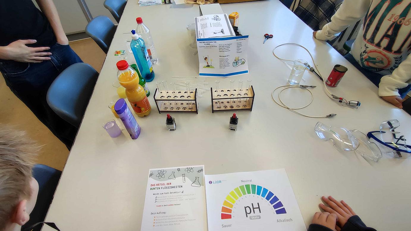 Mitmach-Stationen vorbereitet hatten. Im Fach Chemie staunten die Gäste nicht schlecht: Hier wurde Strom aus einer Coladose erzeugt,